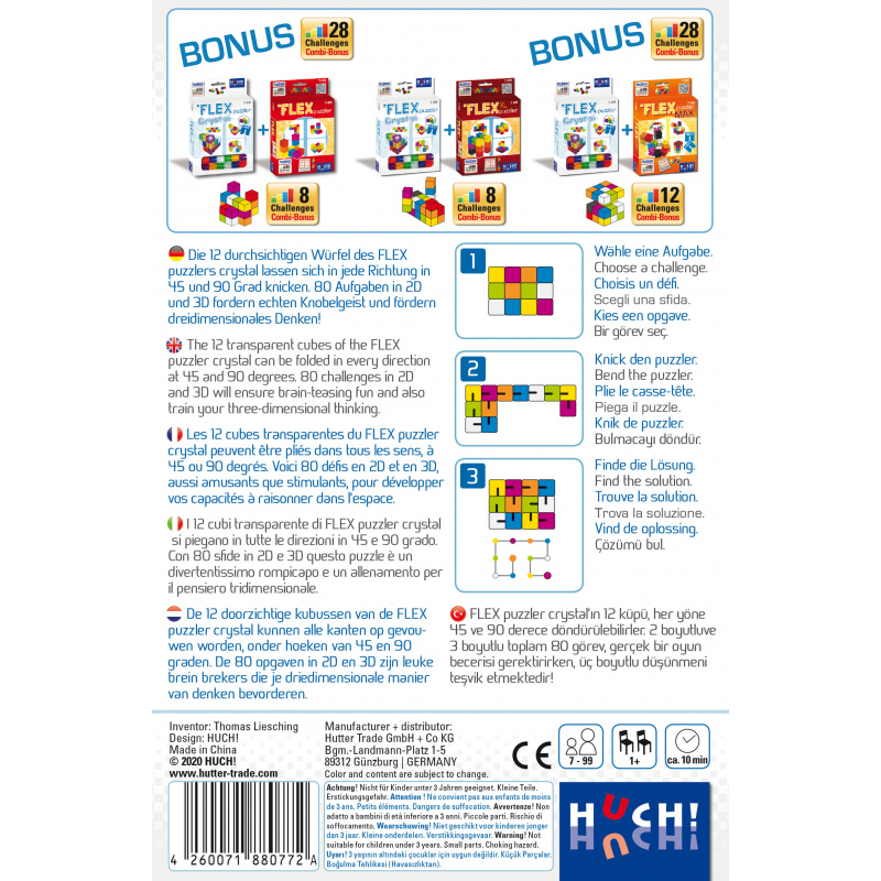 Une chaîne de 12 cubes colorés translucides qui peuvent être orientés et pliés dans toutes les directions à 45° ou 90°.