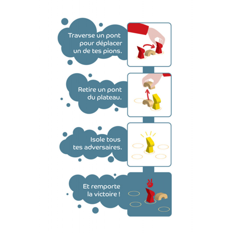 Chaque joueur à son tour déplace un de ses lutins d'une case et retire un pont sur le plateau. Le dernier joueur à pouvoir encore bouger un de ses lutins a gagné !