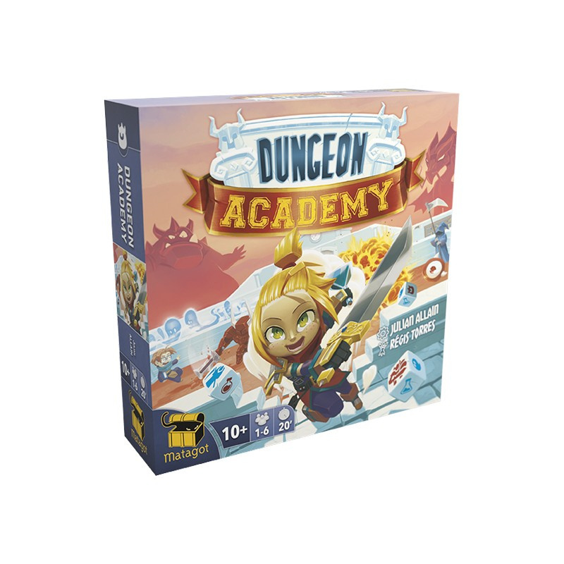 DUNGEON ACADEMY Créez votre propre donjon en secouant les dés et relevez les défis de cet incroyable labyrinthe ! Incarnez un valeureux apprenti héros et parcourez le donjon afin d'accomplir une série de quêtes qui vous rapporteront de la gloire. Collectez des points de vie et de mana pour tenter de battre les monstres qui se dresseront sur votre chemin jusqu'à la salle au trésor ! Qui ressortira vainqueur et diplomé de cette course effrenée ? L'univers, les graphismes et la mécanique, en apparence simple, font de Dungeon Academy un jeu parfait pour toute la famille ! Proche du jeu vidéo, il ravira également les gamers à la recherche d'un jeu rapide et fun.Extensions disponibles pour Dungeon Academy